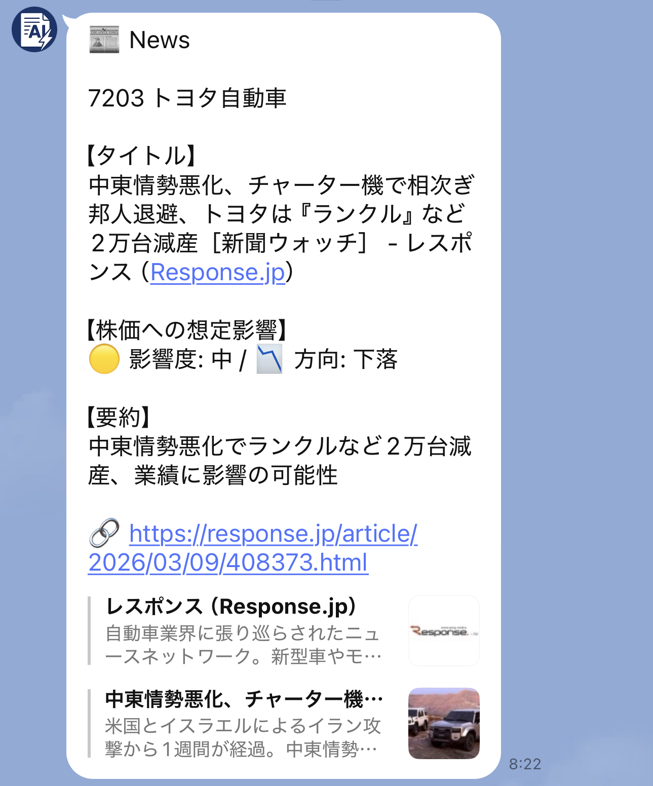 日中は仕事で相場を見られない。でもLINEに要約が届くから、通勤中や昼休みにサッと確認できる。帰宅後の判断がスムーズに。